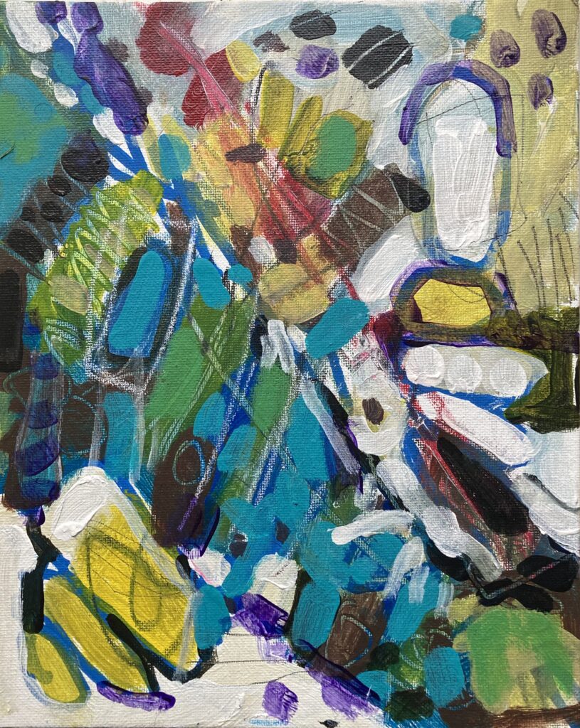 I see how the pencil lines in my painting tuck under a brushstroke here, and glide over a patch of paint over there.  The lines I scratch into the wet paint with the other end of my brush mimic the other, positive lines in the composition.  Those scratches uncover some of the hidden layer that lurks beneath pigment that was applied later.  The fresh brushstroke lies right on the surface, not yet realizing that it is a part of the whole.  It thought it was a complete story unto itself until I cut through it.  I reveal the foundation.  What I don’t tell it, is the fact that another layer of paint might come along, obfuscating it completely.
